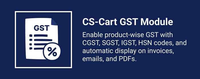 CS‑Cart GST Module enables Indian merchants to apply GST to their products, allowing them to manage CGST, SGST, and IGST with ease.