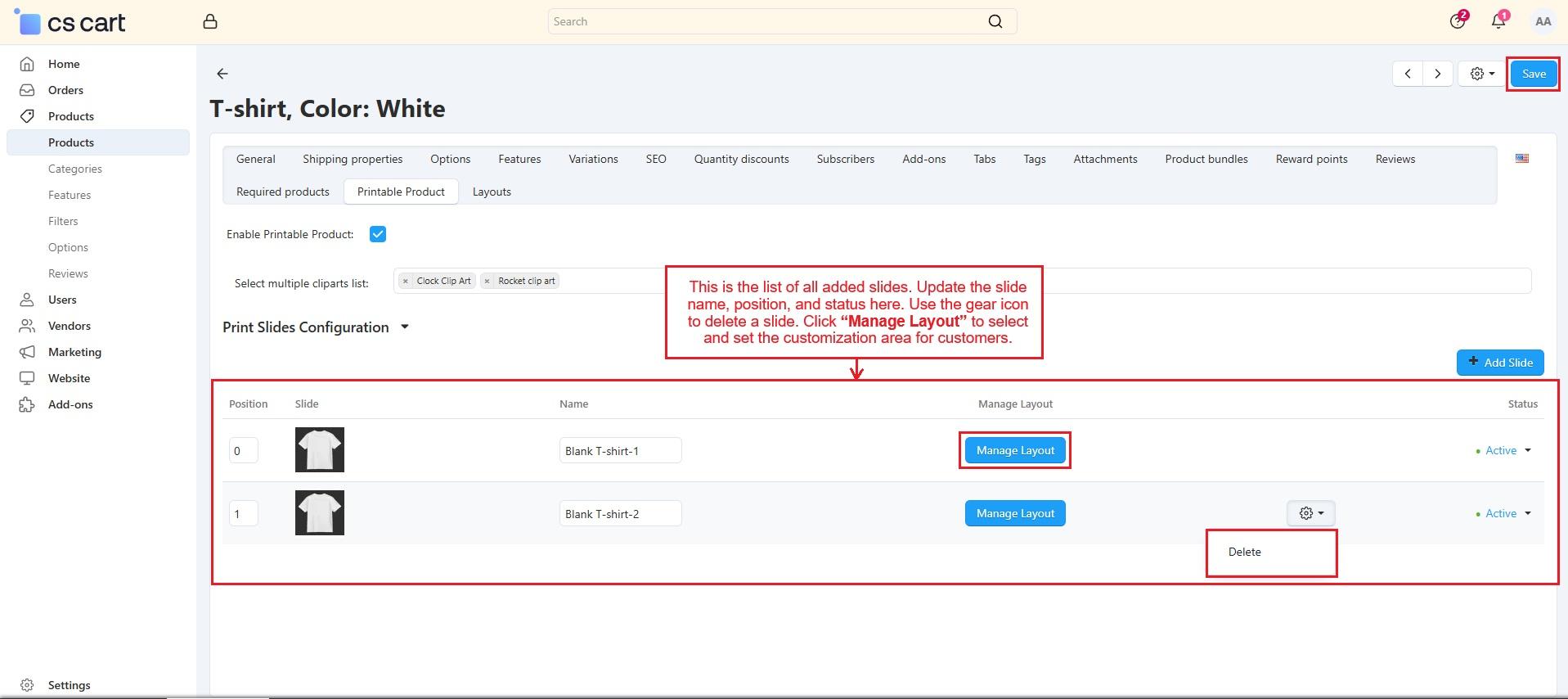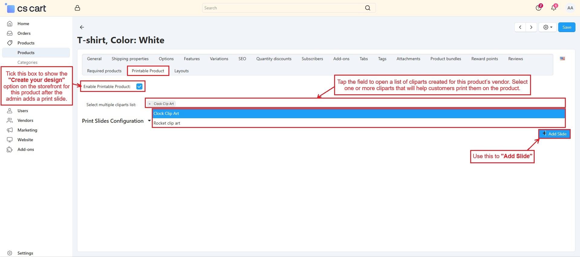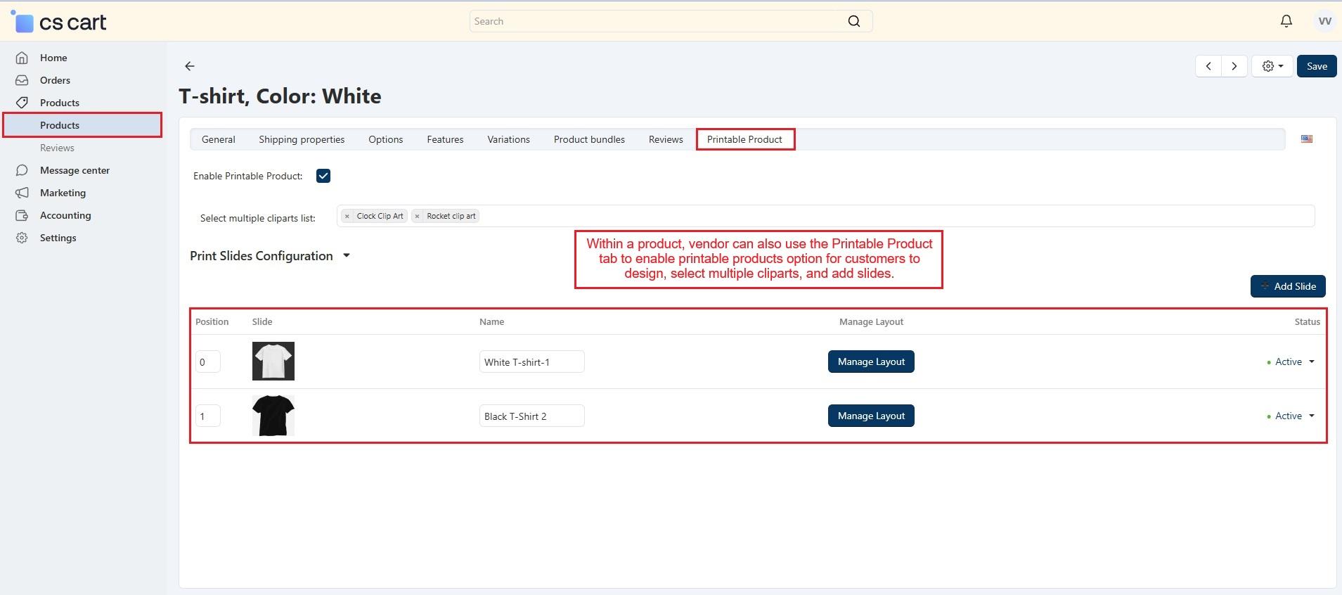 - Vendor Panel also allows vendors to manage clipart and use the Printable Product tab to enable printing, select cliparts, and add slides.