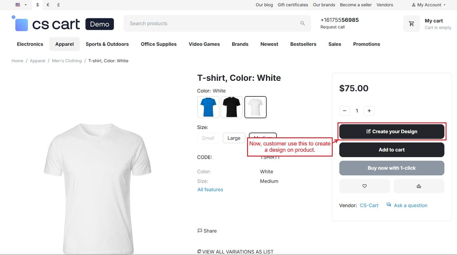 On the storefront, open the product and use “Create Your Design” to start designing.