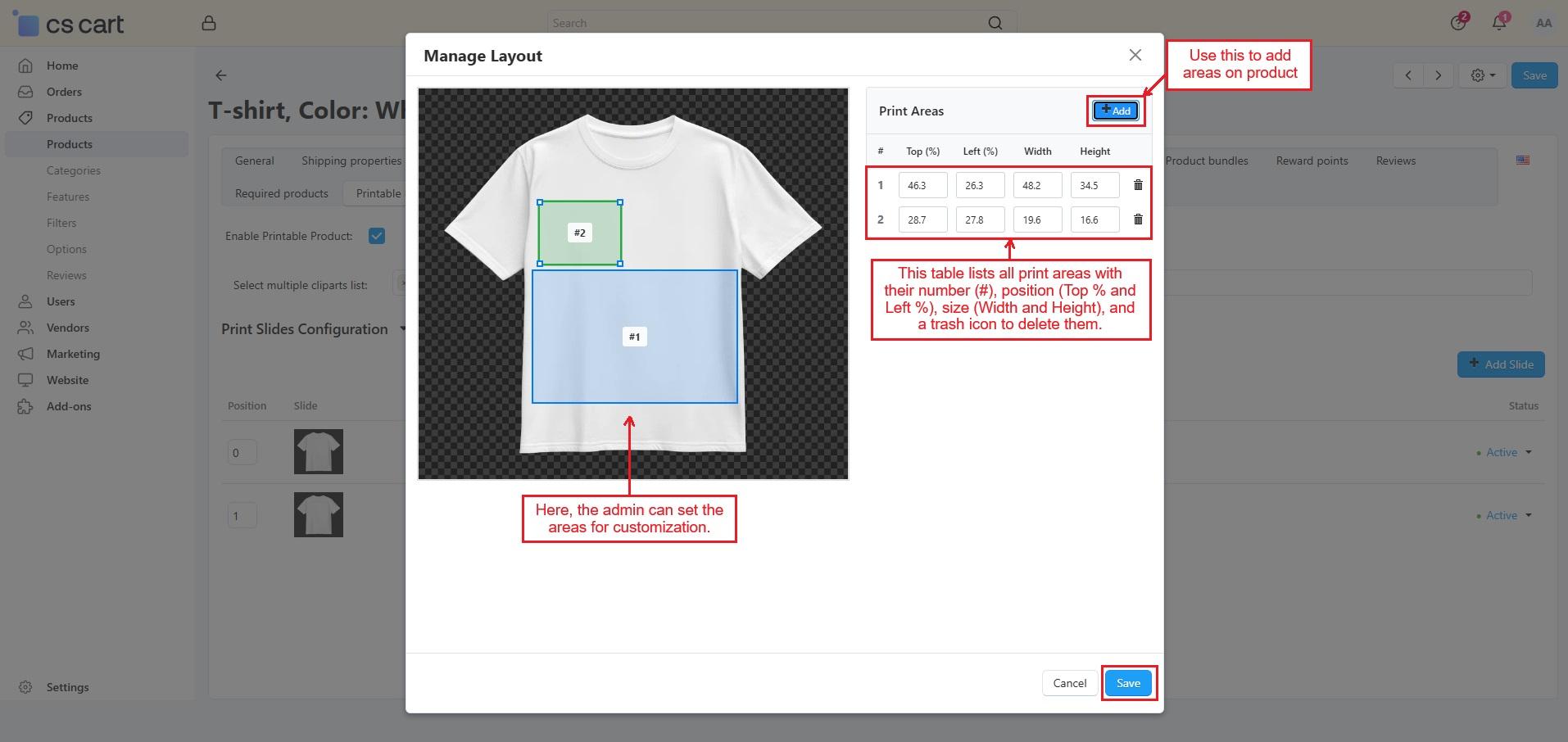 - Product Design Slides & Print Areas: Add slides with customizable product images and define print areas. These areas control where customers place and resize designs.