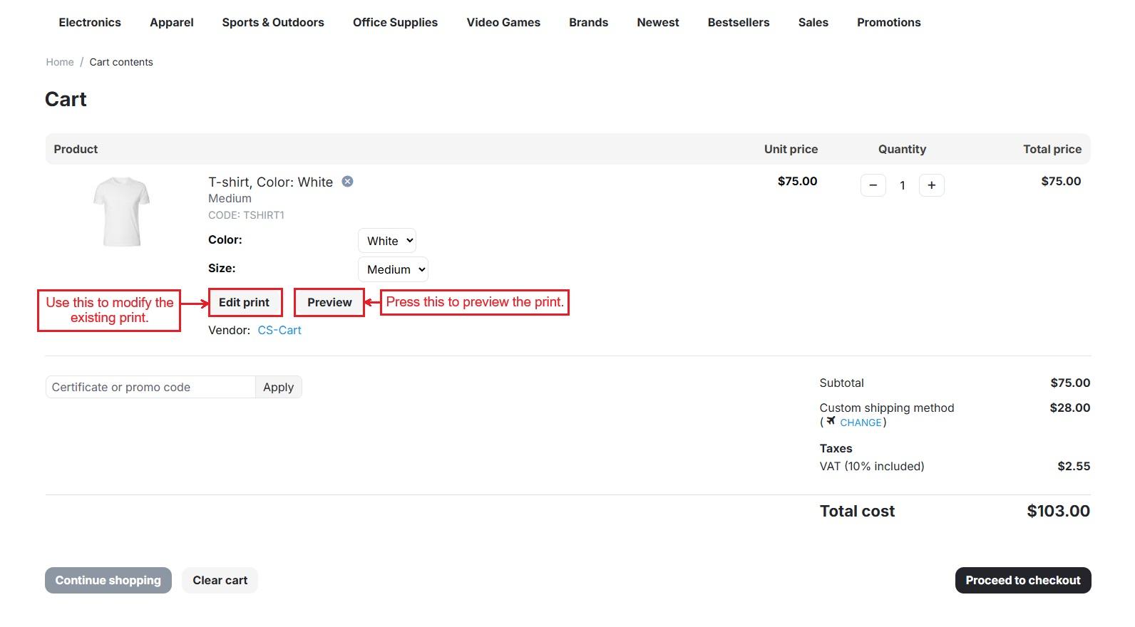 Adding the designed product to the cart shows full details with Edit Print, and Preview options.