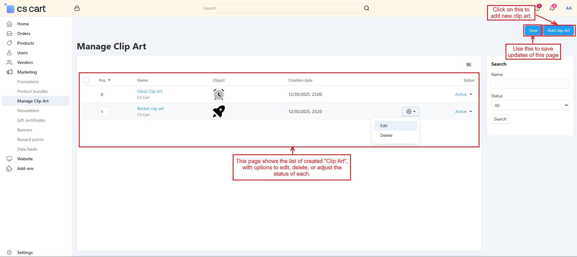 - Access the addon through Items for Menu. The Manage Clip Art section helps control clip art used in product designs for selected vendors.