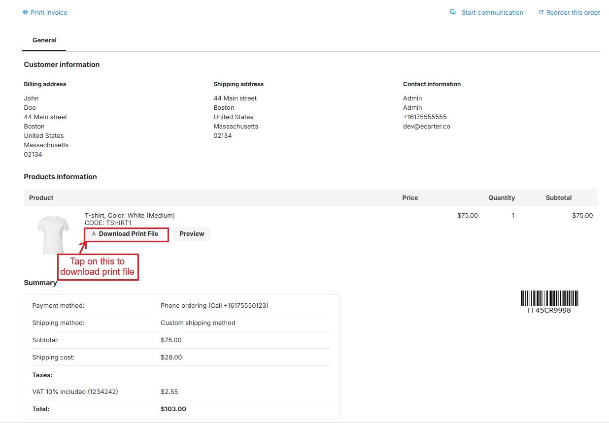 - Downloadable Print Files: The admin and vendor can download print-ready files. Files show full design and element details.
