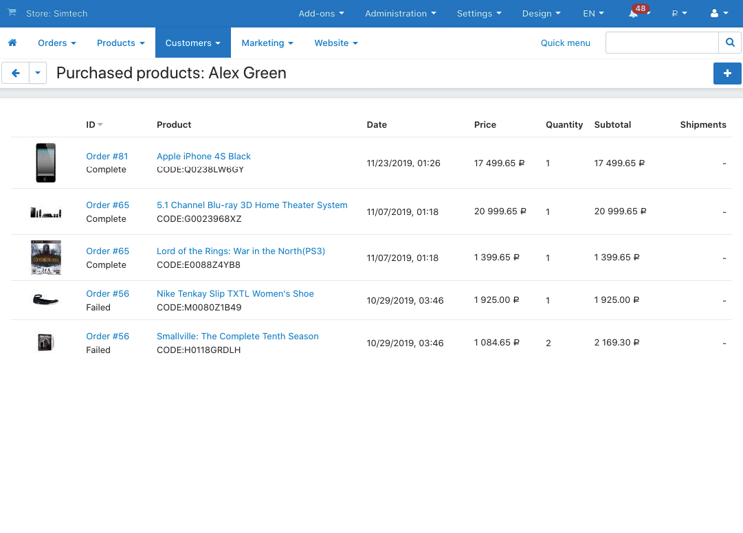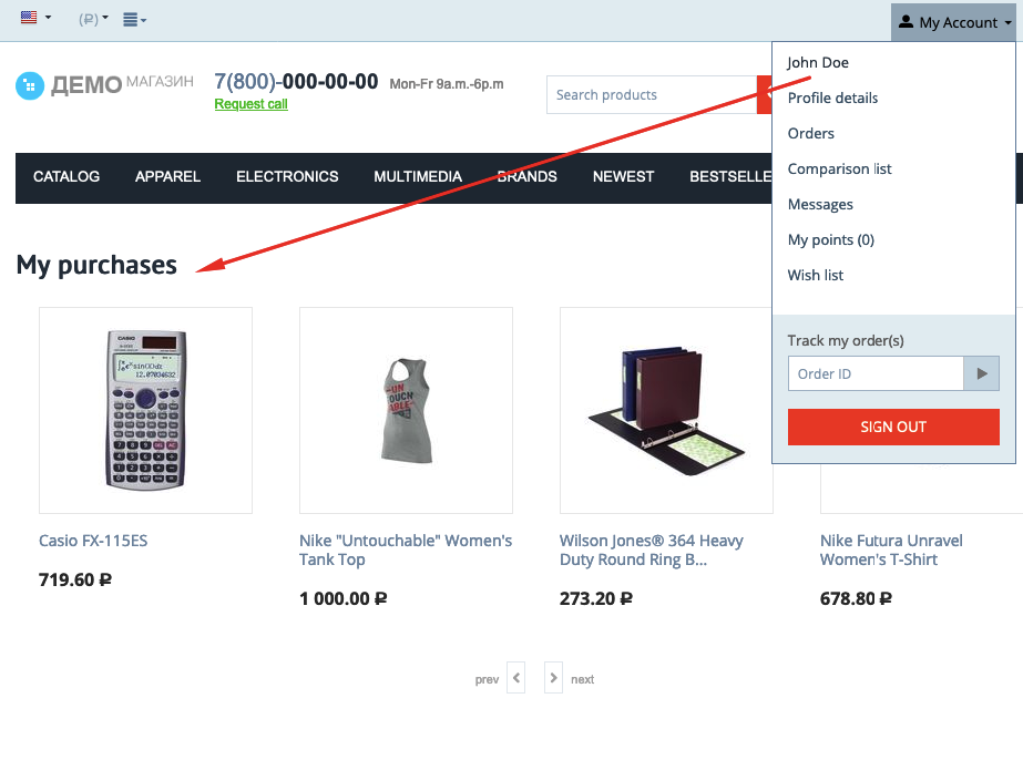 The module allows you to add a block with products purchased by the user. For example, you can add it to the order list page or to the edit profile page.