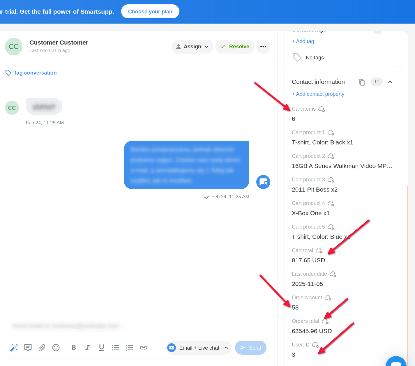 - Automatic customer identification – After a customer logs in, their name, email address, and user ID are automatically transferred to Smartsupp, giving operators immediate access to information about who they are talking to.