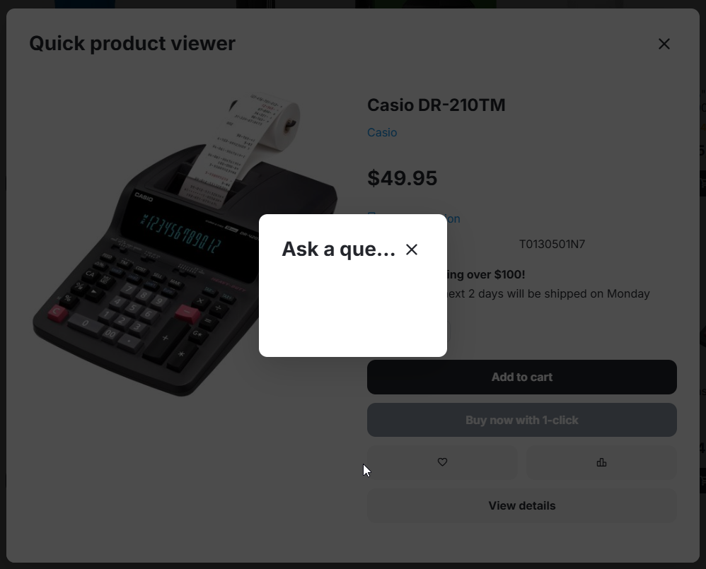 Click Quick view button to display modal. Click Ask a question link.