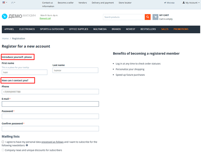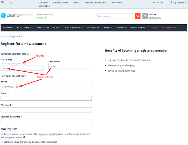 Tooltips (text under the field name or tooltip) and placeholders will give the user additional information and indicate the required input format: