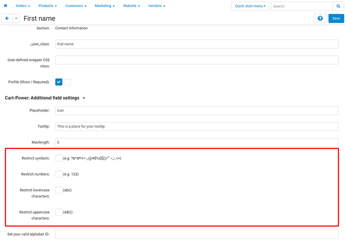 The Advanced Profile Fields add-on empowers standard profile and form fields, allowing the administrator to restrict or specify the use of certain symbols, numbers and characters in them. You will be able to add placeholders and tooltips. The add-on also adds a new field type that allows you to break fields into sections or give them titles.