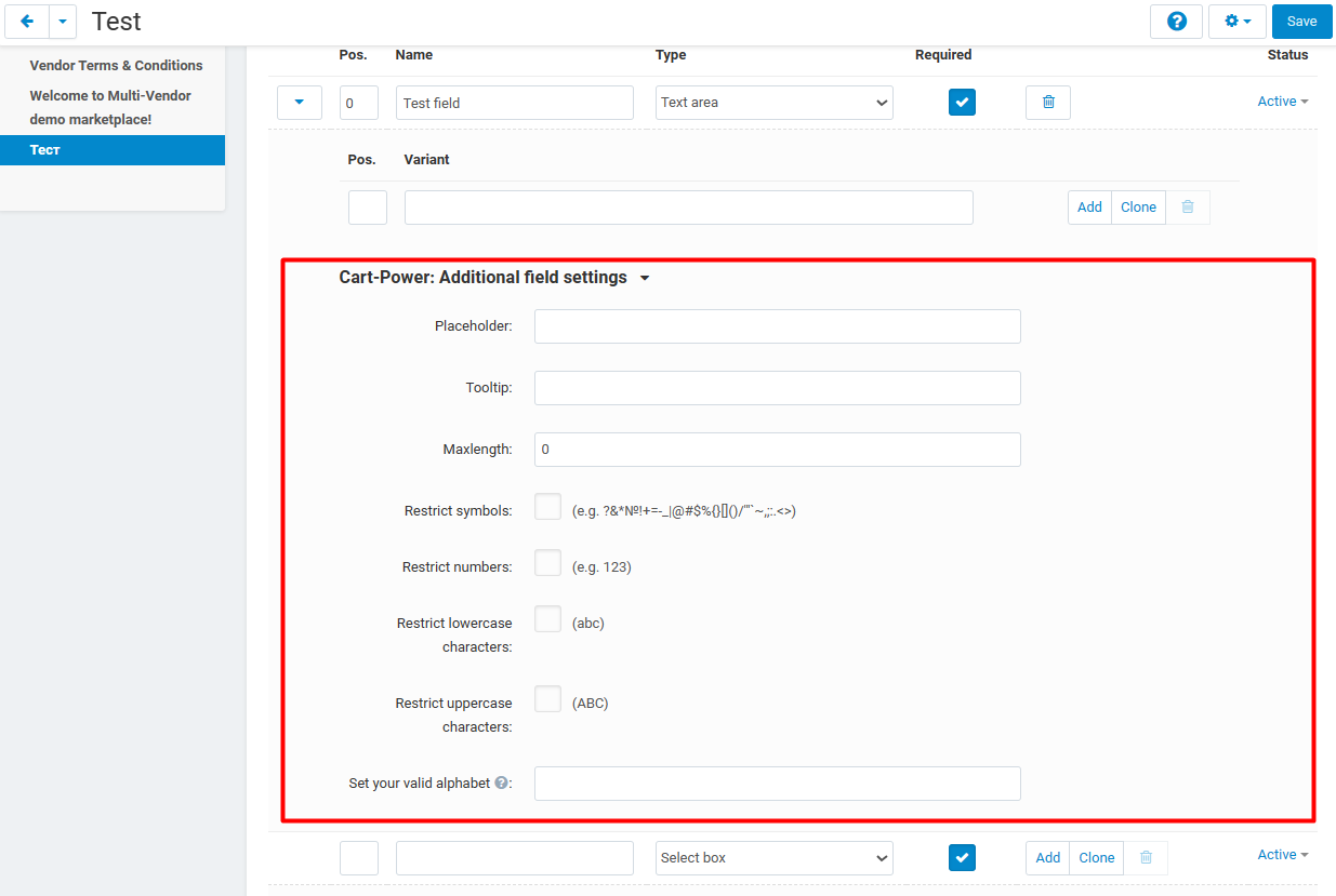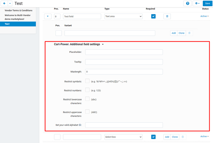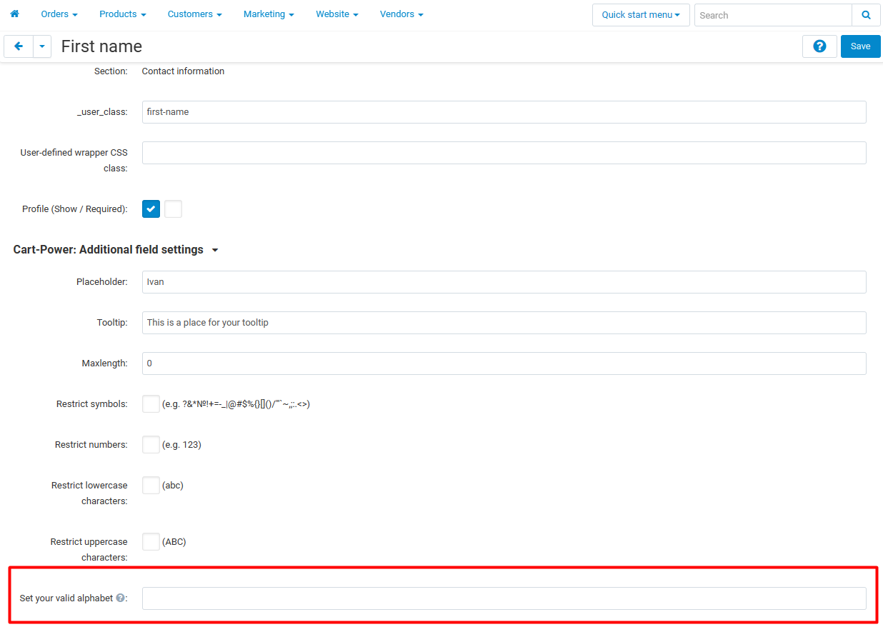 The add-on adds similar settings to form fields (Website > Pages > [Form_name] > Cart-Power: Additional field settings block):