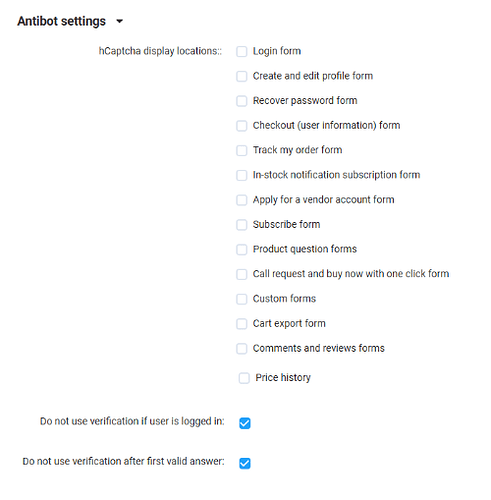 To improve usability and reduce the number of requests to the hCaptcha service, you can disable verification for authorized users and unauthorized users after the first correct answer.