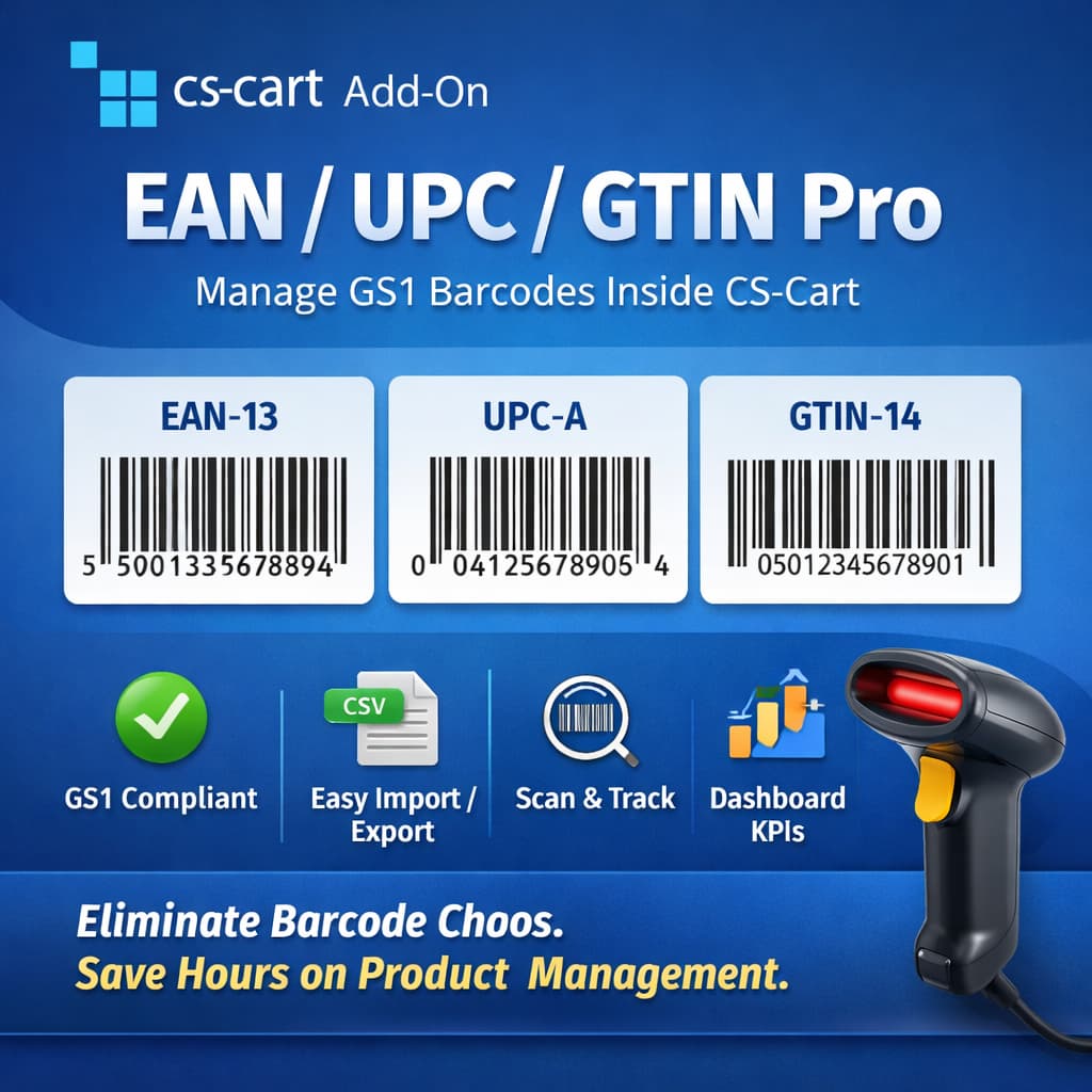 CS-Cart does not natively support GS1 retail barcodes, making this addon essential for selling on platforms like Amazon or Google Shopping.